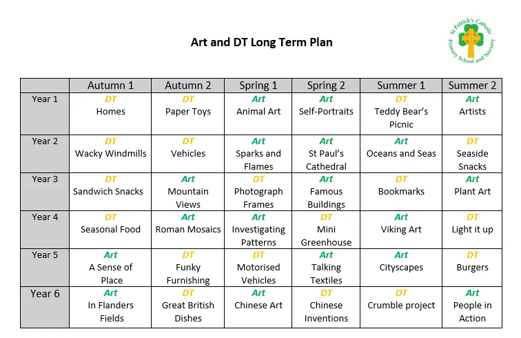 The art and design curriculum at St Patrick’s is based upon the 2014 Primary National Curriculum in England, which provides a broad framework and outlines the knowledge and skills and taught in each Key Stage. Teachers plan lessons for their class using our progression of knowledge and skills documents. Teachers can use these documents to plan their art and design lessons suitable to their class’s interests. The progression document ensures the curriculum is covered and the skills/knowledge taught is progressive from year group to year group.